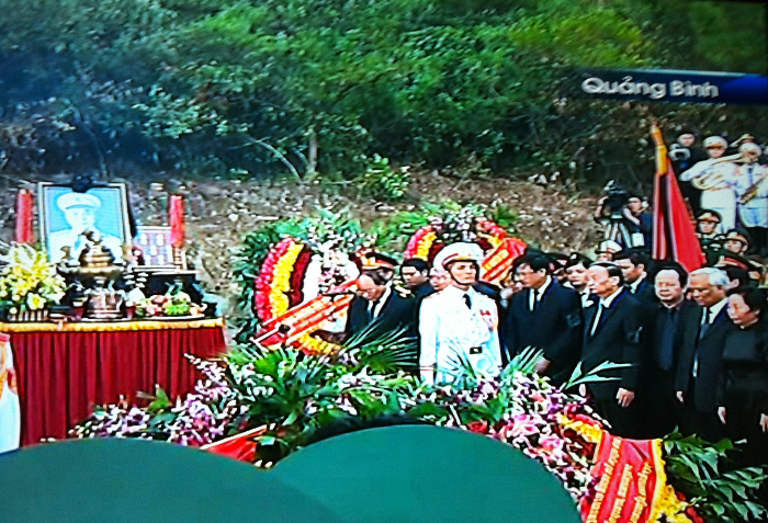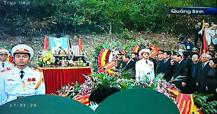 16h07: Lễ hạ huyệt Đại tướng Võ Nguyên giáp diễn ra trong niềm tiếc thương vô hạn của nhân dân quê hương Quảng Bình và của toàn thể dân tộc. Nhân dân nghiêng mình trước người con vĩ đại đã cống hiến cả cuộc đời cho sự nghiệp đấu tranh giải phóng dân tộc, cho sự nghiệp xây dựng đất nước trong thời đại mới.