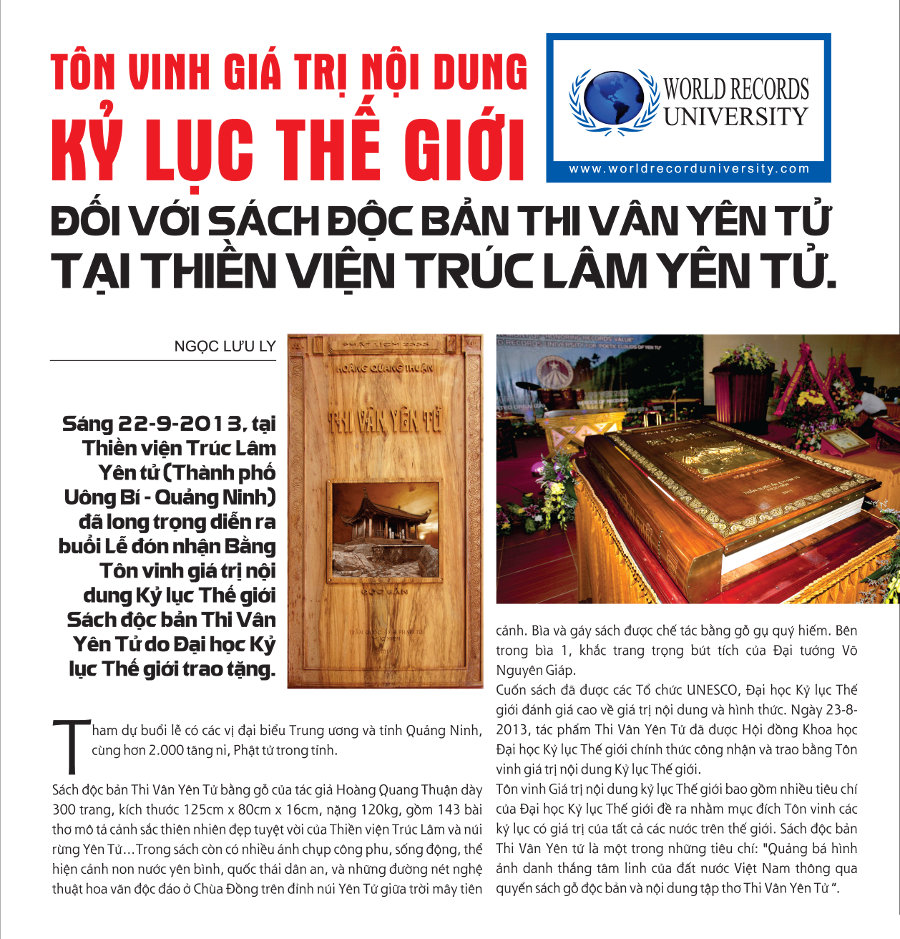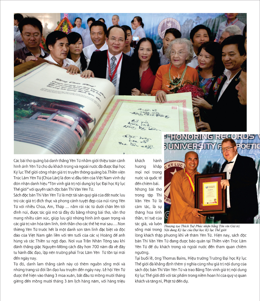 Ông Lê Trần Trường An, Giám đốc Trung tâm Sách Kỷ lục Việt Nam, đã giới thiệu về ý nghĩa việc tôn vinh cuốn thơ Thi Vân Yên Tử thuộc sở hữu Thiền Viện Trúc Lâm Yên Tử (Chùa Lân): “cuốn sách là một tài sản quốc gia lưu trữ các giá trị đích thực và danh thắng tuyệt vời của Yên Tử, giúp lưu giữ các hình ảnh quan trọng và các giá trị văn hóa – tinh thần cho các thế hệ sau”.